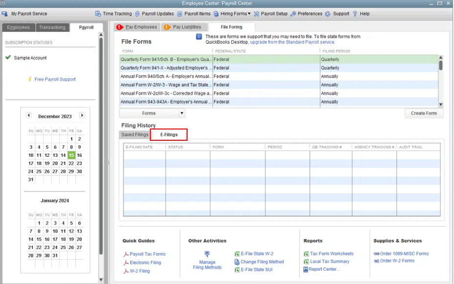 - Choose the Employees tab, click the Payroll Center option, and then the File Forms tab.